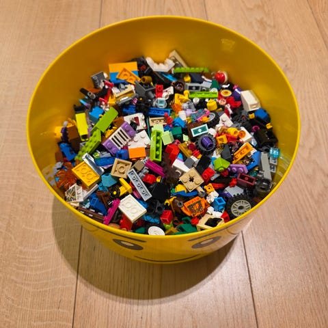 Her får du masse lego til timevis med bygging og lek. Ikea trofast kommode med 11 skuffer. Ypperlig til å sortere lego i farger og tema. Det gjorde vi en gang i tiden så noen av skuffene er merket med farge.