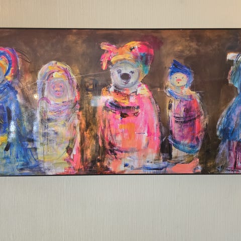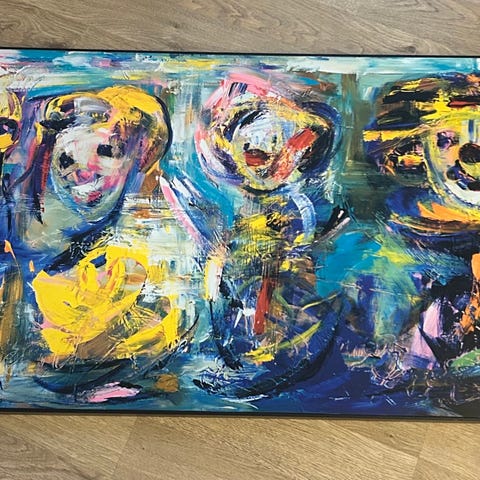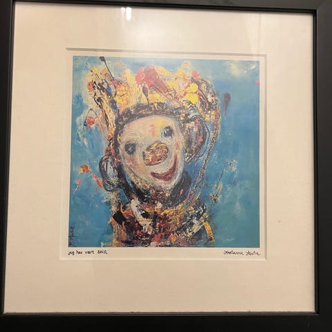Marianne Aulie lerretsbilde trykk med flerfarget klovnemotiv. Passer til dekorasjon i hjem eller kontor.