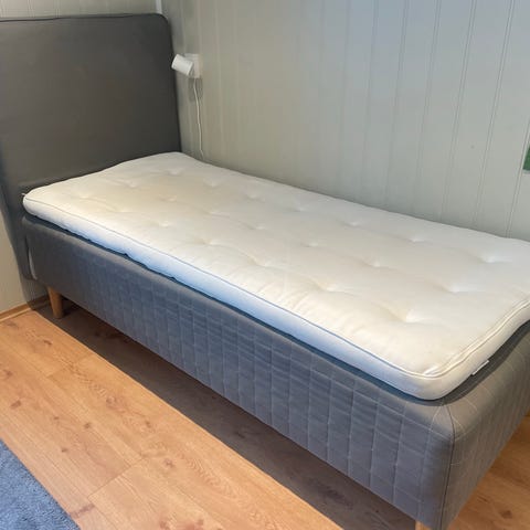 IKEA seng med tilhørende madrass. Sengen har en enkel og funksjonell design med et grått stofftrekk. Madrassen har et hvitt, quiltet trekk. Passer til enkeltsengbruk.