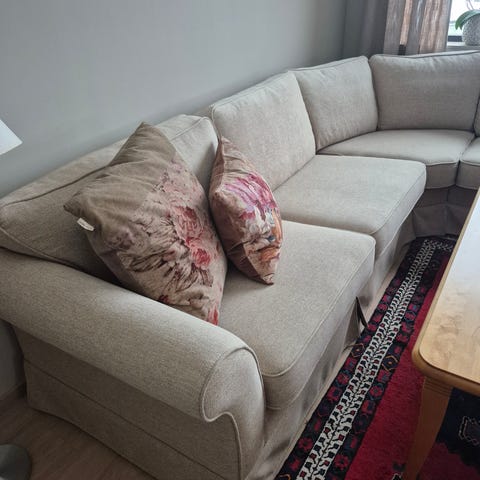 Sofa som er fint ut. Har 2 hull men kan ikke se når man legger på putene