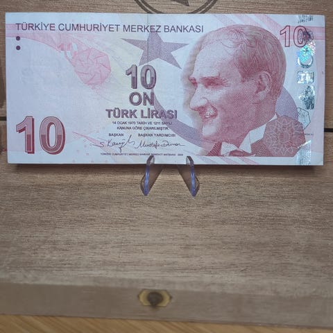 Tyrkisk 20 000 Lira sedler med motiv av Mustafa Kemal Atatürk på forsiden og bygningsmotiv på baksiden.