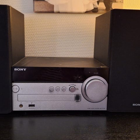 Yamaha stereopakke bestående av en hovedenhet med innebygd CD-spiller og radio, samt tilhørende høyttalere. Enheten har flere kontrollknapper og tilkoblingsmuligheter for lydavspilling.