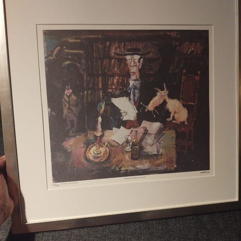 Maleri som viser et landskap med hus og fjell. Bildet har en ramme i gullfarge. Fargene i maleriet inkluderer mørke og jordnære toner. Malt av Carl jerv