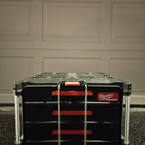 Milwaukee Packout verktøykasse i sort og rød farge. Laget for oppbevaring og transport av verktøy og tilbehør. Robust konstruksjon med låsemekanismer for sikker lukking.
