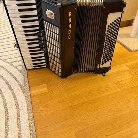 Selger et Capriole piano-trekkspill i klassisk rød perlemor-finish. Dette er et eldre, tradisjonelt trekkspill med solid byggekvalitet, godt egnet for hobbyspillere, nybegynnere eller samlere av vintage instrumenter.