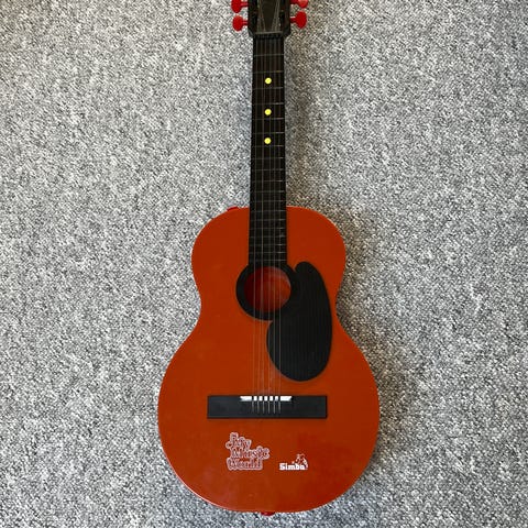 Selger 2 gitarer til barn. Skulderfestet på den rosa gitaren har røket, men gitaren fungerer like godt uten. Med knappen som man trykker på gitarhalsen og gir lyd.
