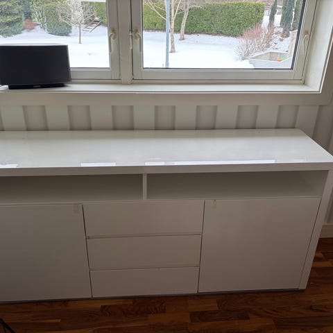 Stor hvit skjenk til salgs. Noen bruksmerker men dette er et solid møbel som fungerer fint. Forrige eier sa at skapet var kjøpt på Møbelringen. Romslig med god lagringsplass. Møbelet må hentes av kjøper. Det er tungt å bære.