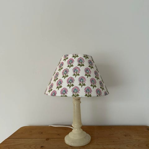 Stor messinglampe med håndlaget skjerm i stoff fra Studio Bazar