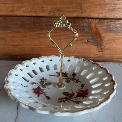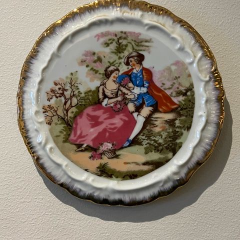 Nydelig dekorert porselensfat med blomster- og portrettmotiv