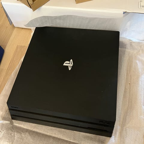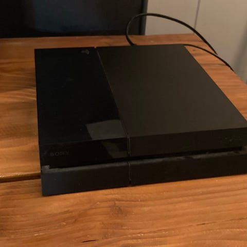 1 generasjon Playstation 4 spillkonsoll med tilhørende kontroll, ledning og ørepropper.
