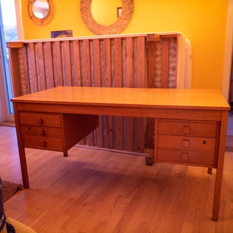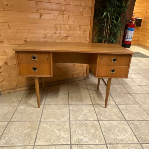 Pent brukt, teak eller mahogni type treverk, og aluminium. Det mangler noen av skrueskjulerknottene i plast, men har ingenting å si for funksjonen.
