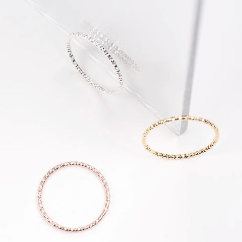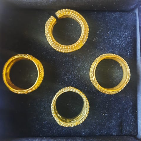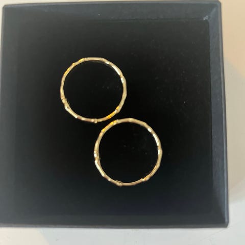 Dette er en kul, enkel, gullfarget ring fra Ovela. Ringen har et fint, ruglete mønster og fin glans. Ringen er ny, ikke brukt, og jeg har tre stykker. Jeg tipper det er ca ringstørrelse 54. De er fine sammen! Det er bijoutteri (ikke edelt metall). Alle ringene kommer med eske, men det står ikke riktig størrelse under alle eskene.