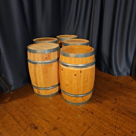Tønne i tre med metallbånd, høyde ca. 60cm, diameter ca. 37 cm. Egnet til lagring eller dekorasjon. Laget av eik. Mulig brukt til brennevin. Fine til bord .Selges kr 850 stk.