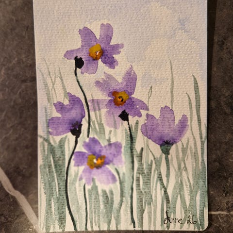 Selger håndmalte kort i pakker på 5. Hvert kort er unikt og malt for hånd på akvarellpapir festet til doble gavekort med konvolutter, farge råhvit.