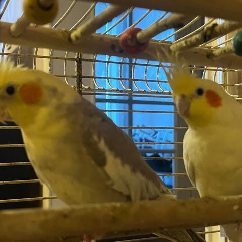 Et par nymfeparakitter selges samlet. Med bur og tilbehør. 2 år gamle.