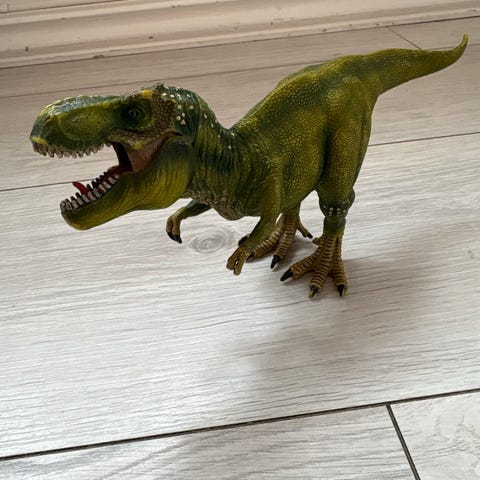 Ukjent merke T-rex dinosaurleke i grønn farge. Leken er detaljert og formet som en Tyrannosaurus rex. Egnet som leketøy eller samlerobjekt.