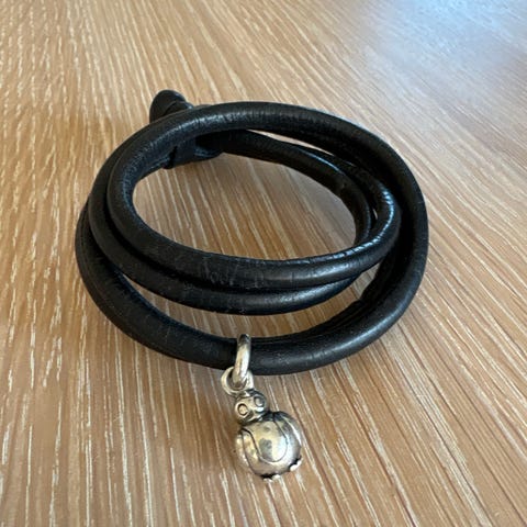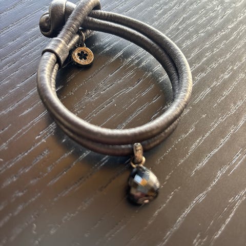 Armbåndet er laget i mørkt skinn med original Sweet Drops-lås i oksidert sterlingsølv. Det følger med en Sweet Drops charm med grå månesten (moonstone).