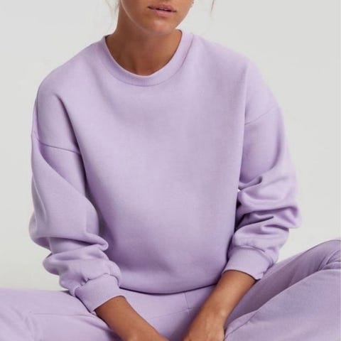 Strikket genser med oversized passform. Genseren er beige og har rund hals. Den har lange ermer, utringede skuldre og ribbestrikk ved ermeslutten og i nedre kant.