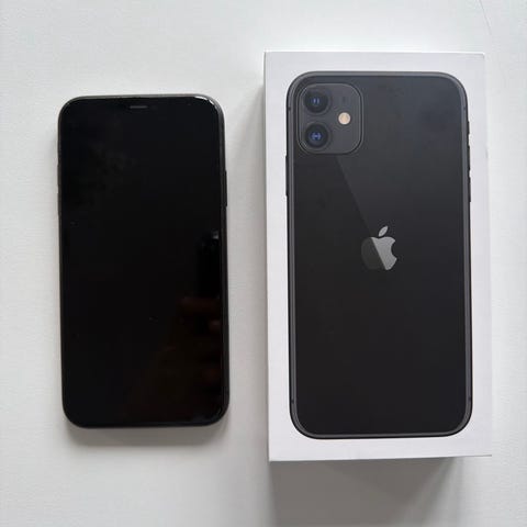 Apple iPhone 11 med 64 GB lagringskapasitet. Telefonen har et front- og bakkamera med flere linser. Fargen er svart/mørk grå. Brukt svært forsiktig av en eldre mann.