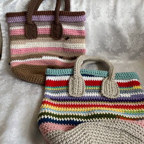 Heklet veske med pastellfarger, flerfarget stripemønster og brune håndtak. Vesken har glidelås på toppen og en innvendig lomme med glidelås