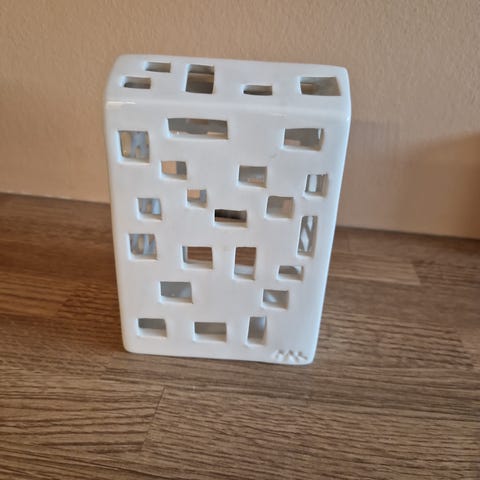 Kähler dekorasjonslanterne i hvit keramikk. Lanterne med utskjæringer i form av vinduer og dør, designet for dekorativ bruk innendørs.