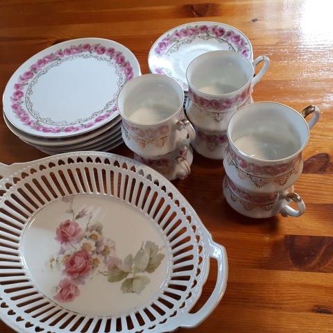Kaffeservice med kopper, skåler og tallerkner