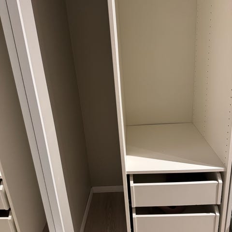 Pent brukt PAX garderobe fra IKEA selges med skuffer og innhold som vist på illustrasjon.