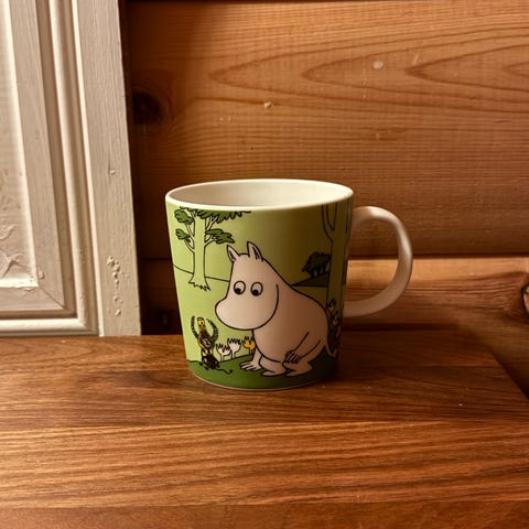 Arabia Moomintroll kopp med motiv av Mummitrollet, laget i keramisk materiale. Koppen har en grønn bakgrunn med illustrasjoner av Mummitrollet og andre karakterer fra Mummidalen. Egnet for daglig bruk og kan vaskes i oppvaskmaskin.