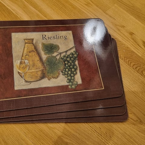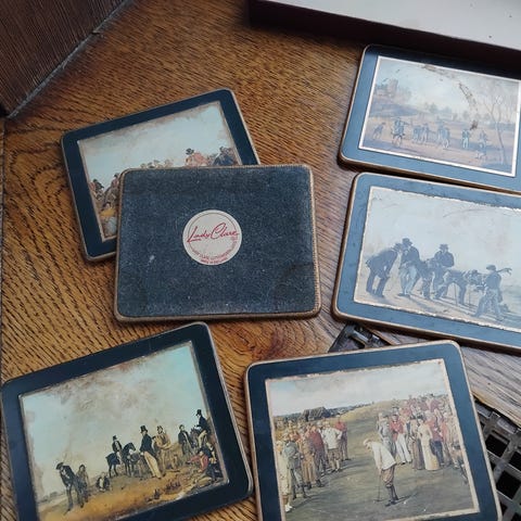 Både glassbrikker og forskjellige størrelser på tallerkenbrikker. Placemats. Dekorative med revejakt-tema. Kommer i forskjellige str og antall.