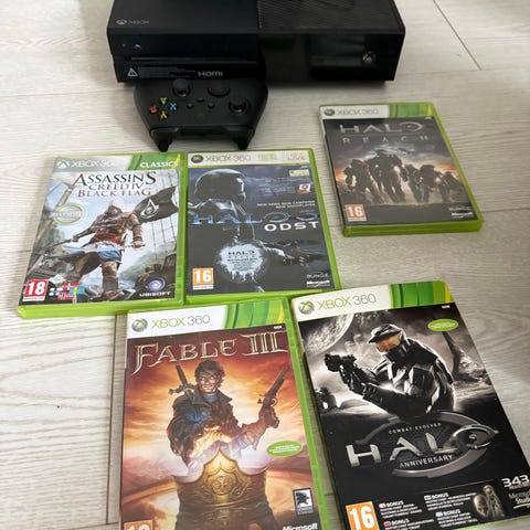 Xbox One spillkonsoll med tilhørende trådløs kontroller. Konsollen er designet for å spille Xbox One-spill og tilbyr ulike underholdningsmuligheter.