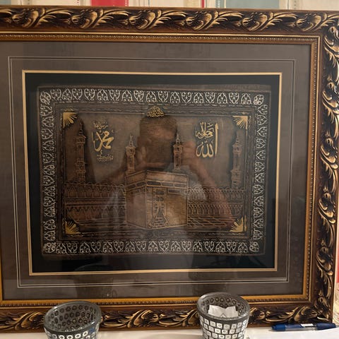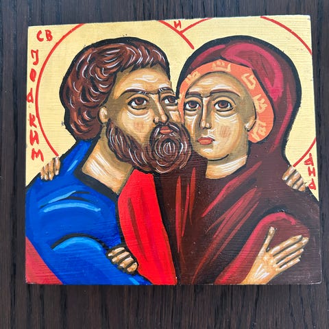 To ikonbilder med religiøse motiver malt på treplate. Den ene viser to helgener med krone og kors, den andre viser Jomfru Maria med barnet. Begge har gullfargelementer og er festet med krok på baksiden for oppheng. Tekst på baksiden beskriver motivene og opprinnelsen. Selges 400kr pr. stk eller samlet 700kr