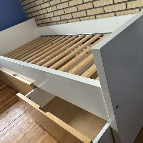 Oppbevarings skuffene har hjul og sitter ikke fast i selve sengen.