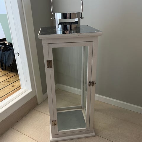 Selger en pen lanterne i lyst treverk og metall. Den har glassvegger, tauhåndtak og en praktisk dør med haspe. Perfekt for kubbelys.