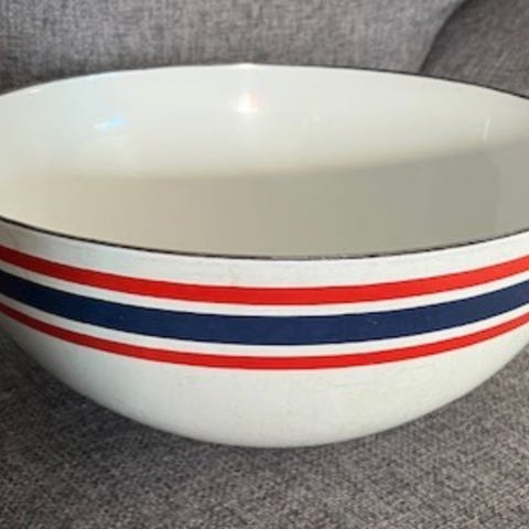 Vintage stor hvit / kremfarget emaljert bakebolle / miksebolle i metall, med rød kant. Til baking, matlaging, eller som dekorativ bolle til frukt og grønnsaker etc.
