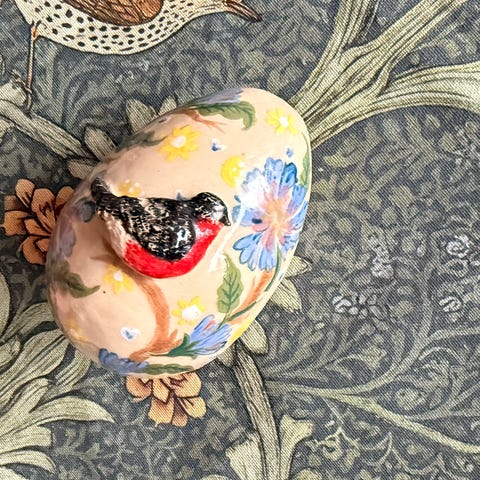 Håndmalt keramikk påskeegg med fugl og blomster