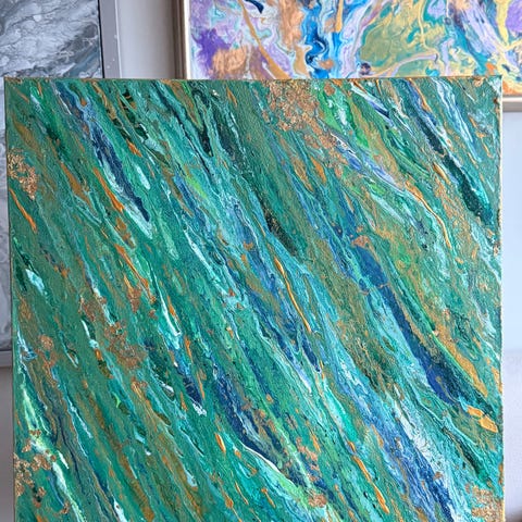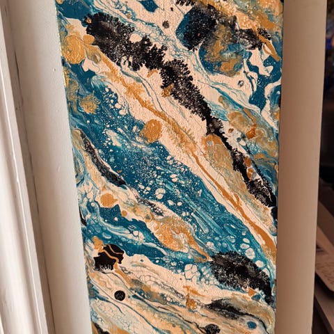 Abstrakt maleri med dimensjoner 50x40cm, i blå og gullfarger. Maleriet har en flytende, marmorerende stil inspirert av havet