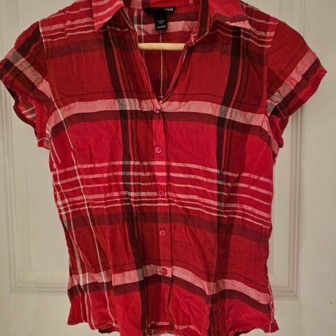 H&M skjorte i pen blålilla farge, størrelse 32 (men passer fint til en 34 også). Laget av 100% bomull. Veldig tynt og lett stoff.
