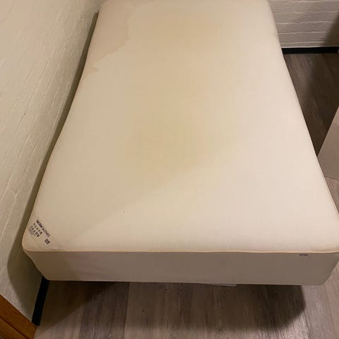 IKEA Sultan seng med grått trekk. Sengen har en enkel og funksjonell design, egnet for soverom. Overmadrass på 5 cm. medfølger.