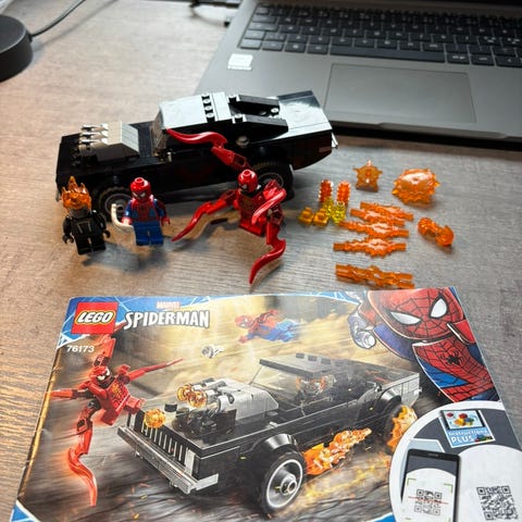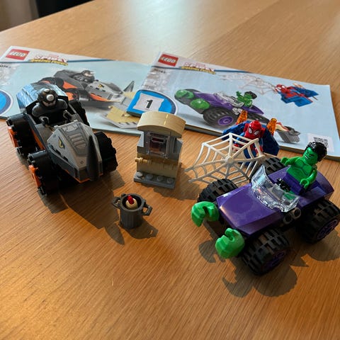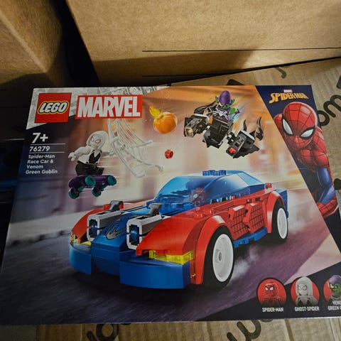 Lego Marvel bil selges. Byggesettet er bygd opp og tatt fra hverandre. Settet er komplett.