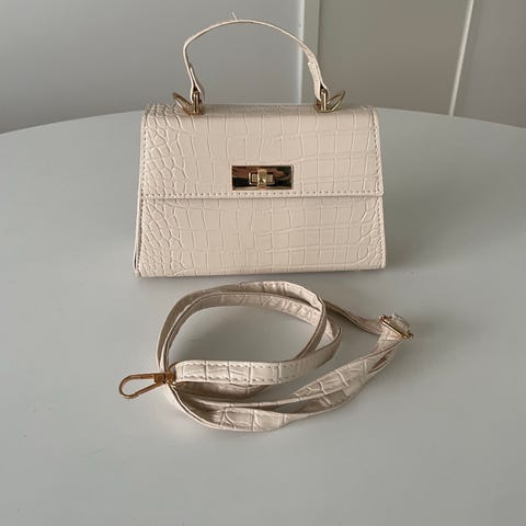 Vesken har en skulderrem og en glidelås for lukking. Si ifra om du ønsker flere bilder:)