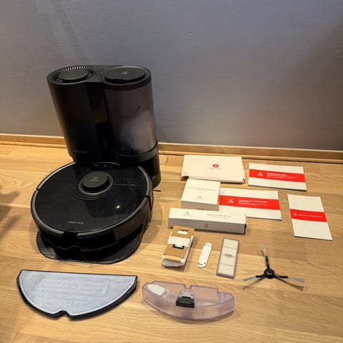 Pent brukt Roborock S7+ robotstøvsuger med selvtømmingsstasjon i svart.