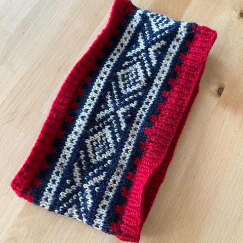 I ull. 9 cm bredt, 53 cm rundt. De er tøyelig.