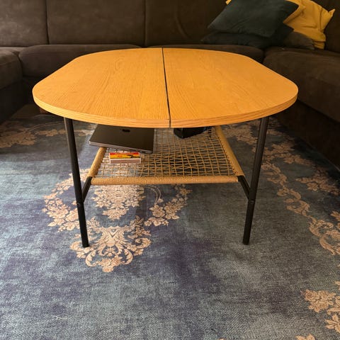 Pent rundt stuebord i hvitt, passer fint i stue. Enkel og tidløs stil. Normal bruksslitasje (se bilder), men stabilt og i brukbar stand.