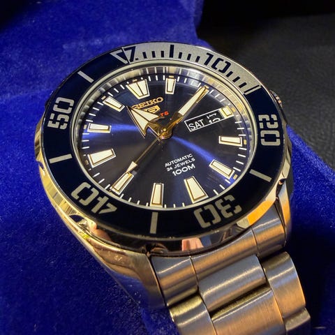 Selger en meget pen og ettertraktet Seiko 5, modell SNXJ92. Dette er den kjente "Datejust"-homagen til Seiko som har blitt et samlerobjekt etter at den gikk ut av produksjon.