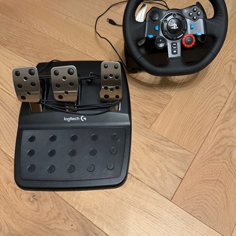 Logitech G29 Driving Force til PS3/PS4/PS5. Komplett sett med ratt og pedalenhet med tre pedaler. Alle kabler følger med. Original emballasje. Fungerer som det skal og gir en veldig realistisk kjøreopplevelse i racingspill.