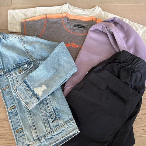 3 dongeribukser med slitte knær, 1 chinos, 1 hettegenser, 1 genser. Benetton, Premium kids, Cubus og Lab industries.