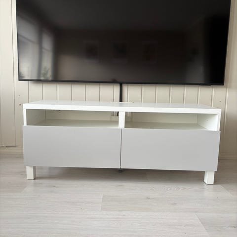 Bestå stamme på 120x40x38cm selges for 499kr mot betaling på vipps. Nypris 895kr, kjøpt for under ett år siden. Brukt som tv-bord. Har borret et hull i bunnen, i venstre hjørne av venstre del, brukt til ledninger. Ikke synlig fra utsiden. Ellers som ny.