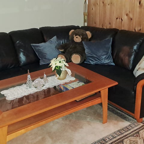 Stor og robust hjørnesofa i sort skinn. Som avbildet. Stol og bord kan følge med hvis ønskelig. Gies bort mot henting i Våle.