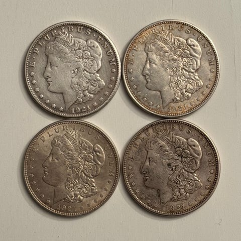 Morgan Dollar amerikansk mynt laget av 90% sølv. Myntene er i varierende tilstand, og viser detaljert preg på begge sider. Egnet for samling eller som investeringsobjekt.