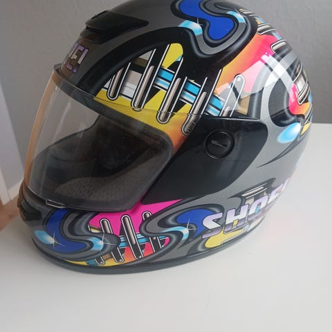 Shoei J-Cruise MC-hjelm i svart farge med integrert visir. Hjelmen har justerbare funksjoner for komfort og sikkerhet, inkludert et låsesystem for visiret. Designet for bruk innen motorsykkelkjøring.